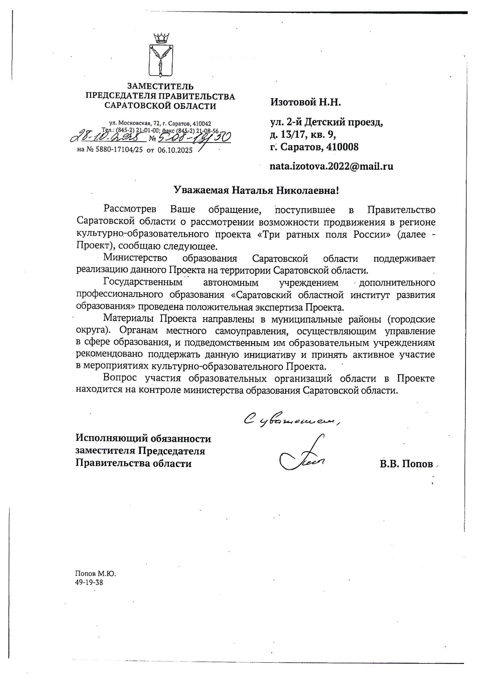 Внедрение в образовательную среду региона культурно-образовательных проектов (в частности — проекта «Три ратных поля России»).